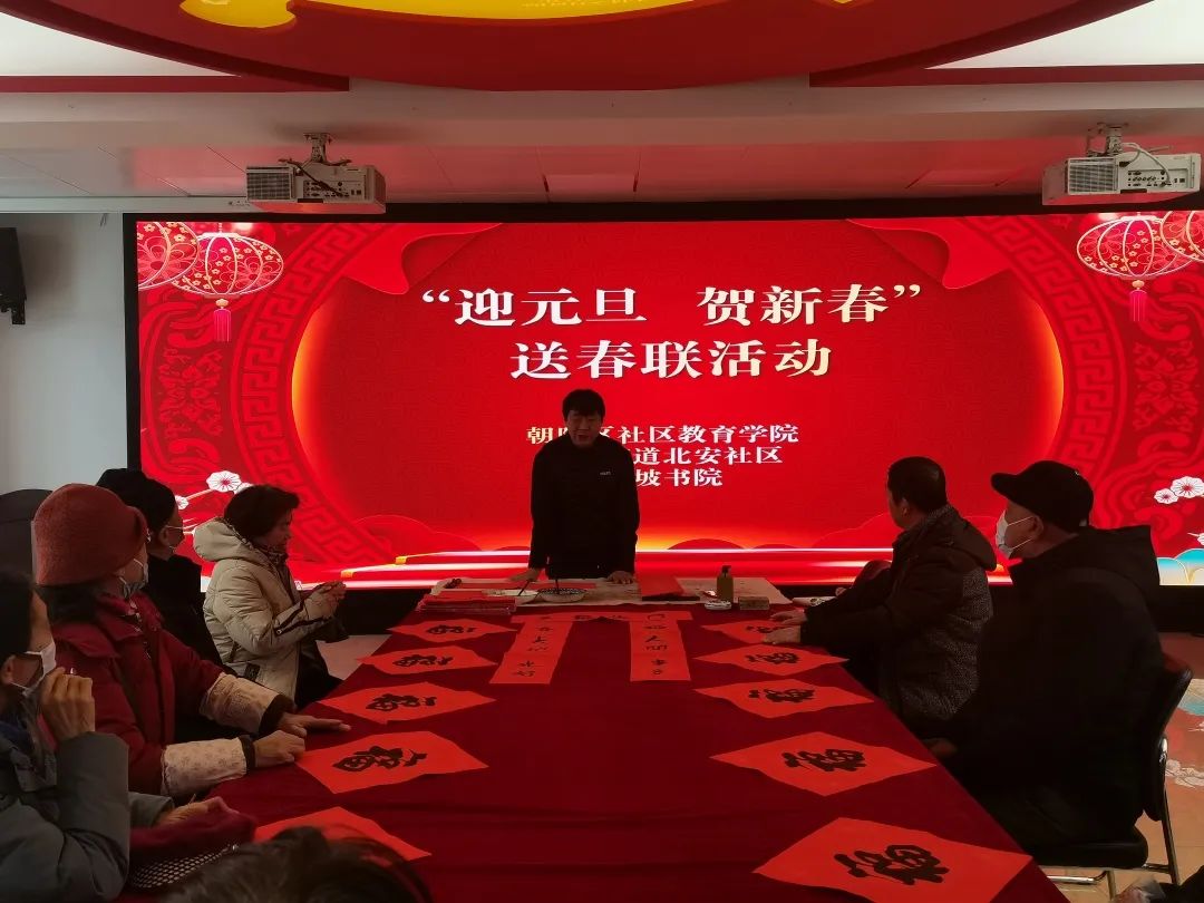 为弘扬营造祥和安康的节日氛围,丰富社区居民文化生活,提升社区居民凝聚力,近日,重庆街道北安社区联合朝阳区社区教育学院、东坡书院在社区新时代文明实践站开展“迎元旦 贺新春”送春联活动,邀请军旅书法家、国家人事部一级书法师苏德生老师为社区居民写春联、送祝福,把美好的祝福与浓浓的关爱送到居民手中。