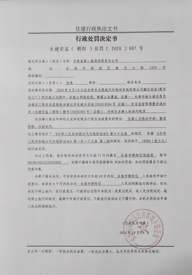 【行政执法】关于吉林省第二建筑有限责任公司违反了《中华人民共和国大气污染防治法》第六十九条规定的行政处罚