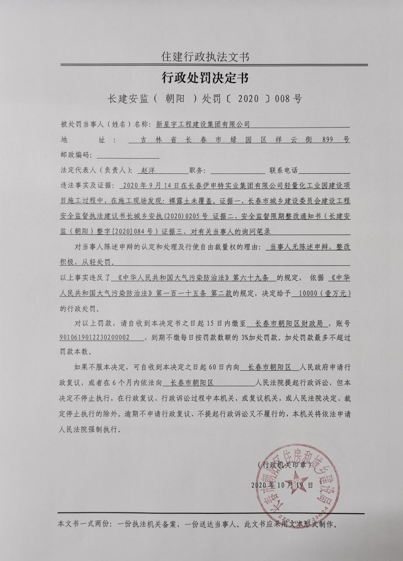 【行政执法】关于新星宇工程建设集团有限公司违反了《中华人民共和国大气污染防治法》第六十九条规定的行政处罚