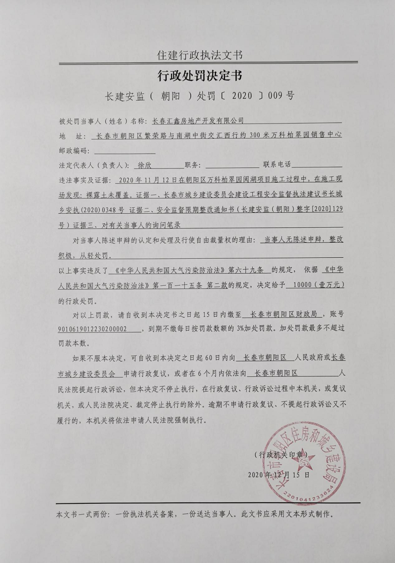 【行政处罚】关于长春汇鑫房地产开发有限公司违反了《中华人民共和国大气污染防治法》第六十九条规定的行政处罚